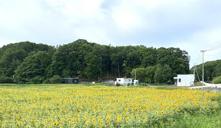 この合流地点の向かい側には、一面のひまわりがまぶしいくらいに咲き誇っていました。(2021.8.3) 色とりどりのコスモスが咲き誇っている年もあります。