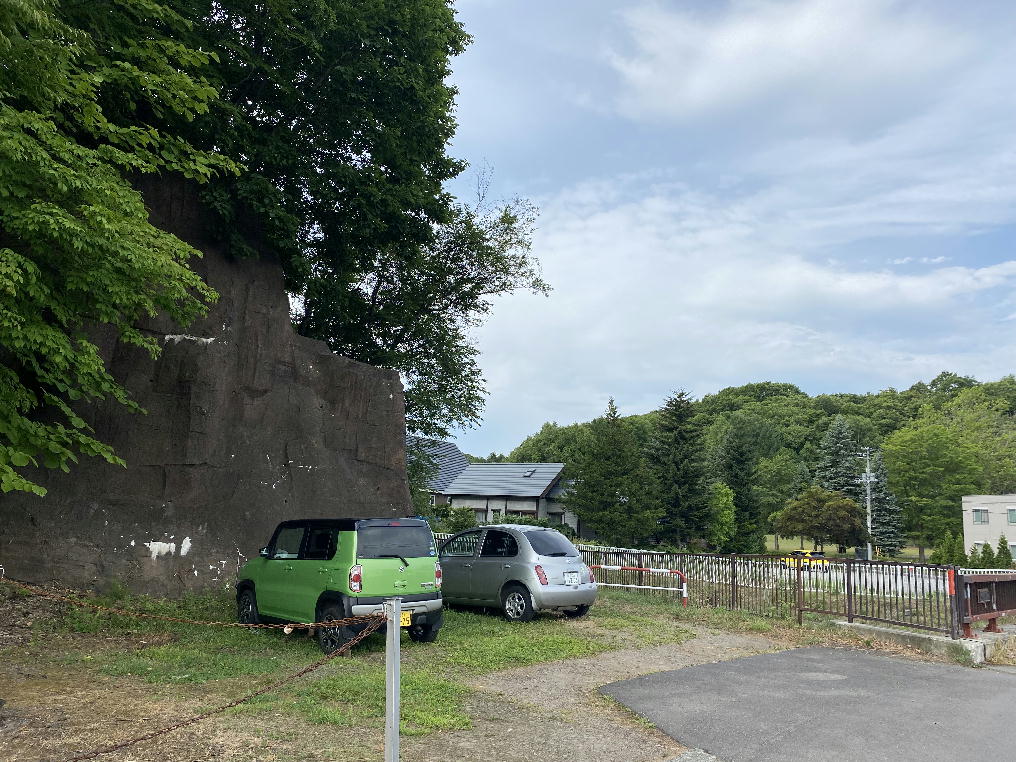 この写真に向かって右側の崖は人工的に岩のように固められており、車が1台ほど止められるスペースがあります。そして、奥の釣り堀まで、(さらに奥の2件目の釣り堀まで)山部川の川っぷちを散策できる緑豊かな道が続いています。